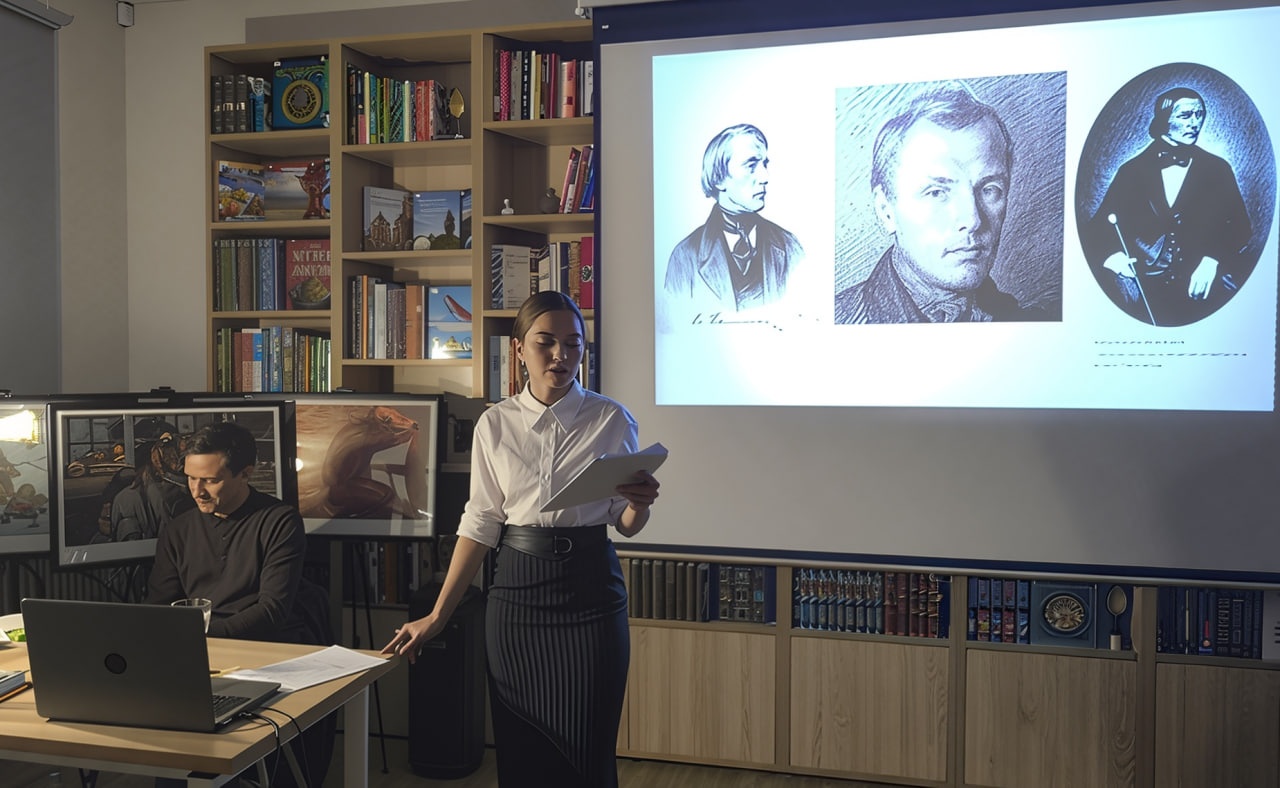 В первые минуты лекции, чтобы погрузить аудиторию в биографию Федра Достоевского, был выведен на экран фрагмент из произведения «Идиот», где князь Мышкин рассказывал о человеке, который пережил минуты от смертной казни до помилования.