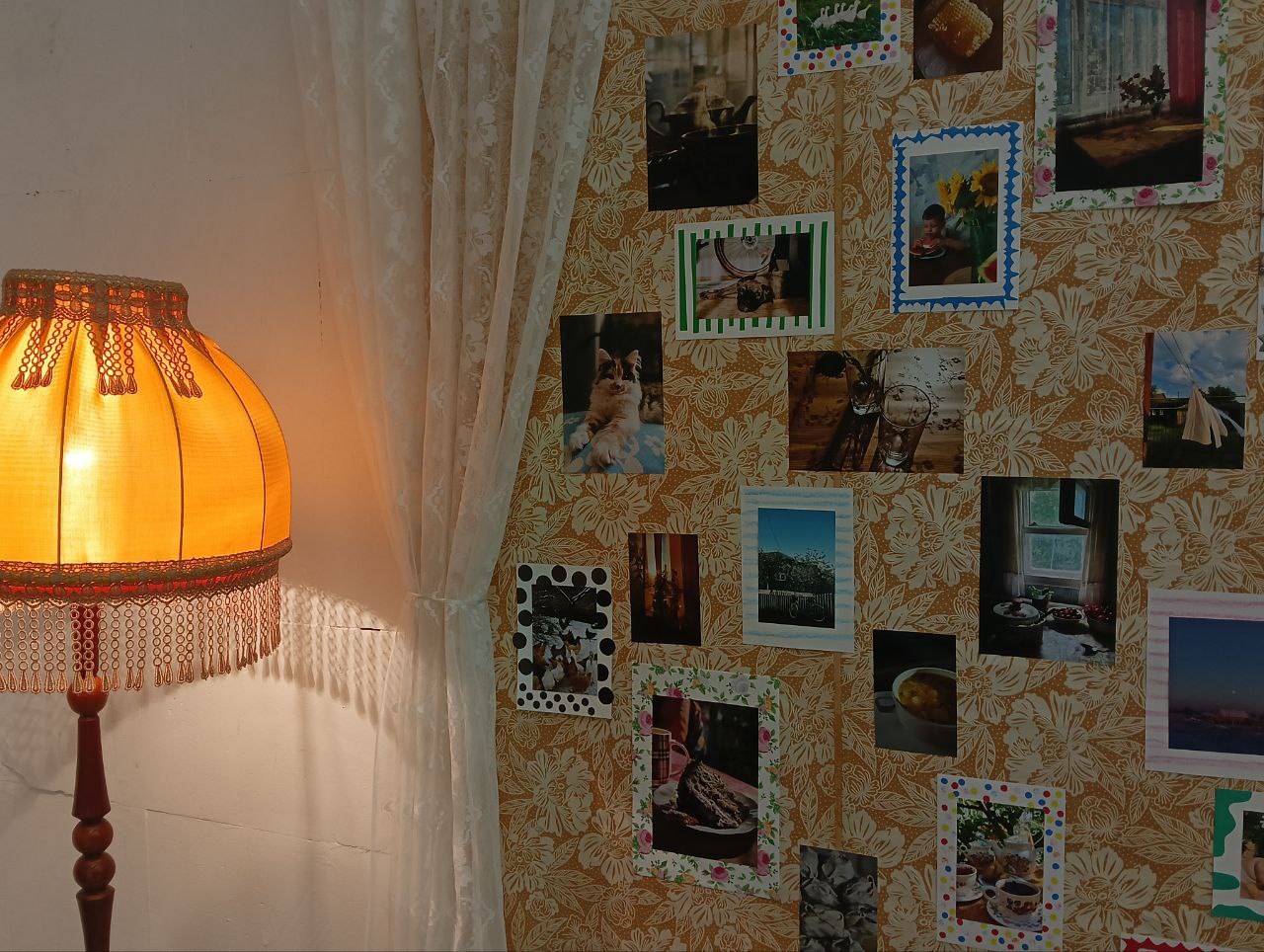 – Хотелось сделать такой уютный уголок, специально для него мы искали торшер, занавески, обои, думали, как это всё закрепить. Девочки сами делали рамки. А ещё здесь расположились баночки «с бабушкиным вареньем», только вместо варенья в них – фотографии.