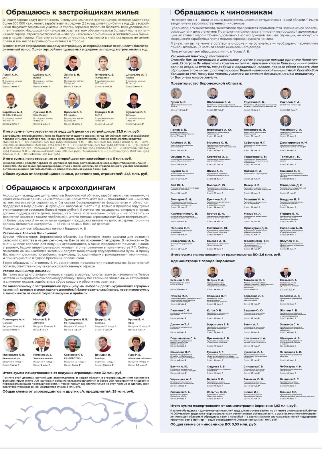 Эта история несколько лет назад прогремела на всю страну. Хамин для того, чтобы собрать много-много денег, а именно 179 миллионов рублей (2,3 млн долл) на спасение полуторалетней девочки Кристины Головчанской с диагнозом СМА (спинальная мышечная атрофия) предпринял совершенно нестандартный ход. Он выкупил в самой популярной газете города четыре полосы и опубликовал там личное обращение к публичным и, скажем так, самым обеспеченным гражданам Воронежа с призывом собрать деньги всем миром. Далее совсем уж необычно: Хамин разместил в газете «иконостас» этих граждан и предложил каждому из них перевести определенную сумму, кому несколько миллионов, кому несколько сотен тысяч, наверное, в соответствии с предполагаемыми доходами. Откликнулись? Нет. Почему?