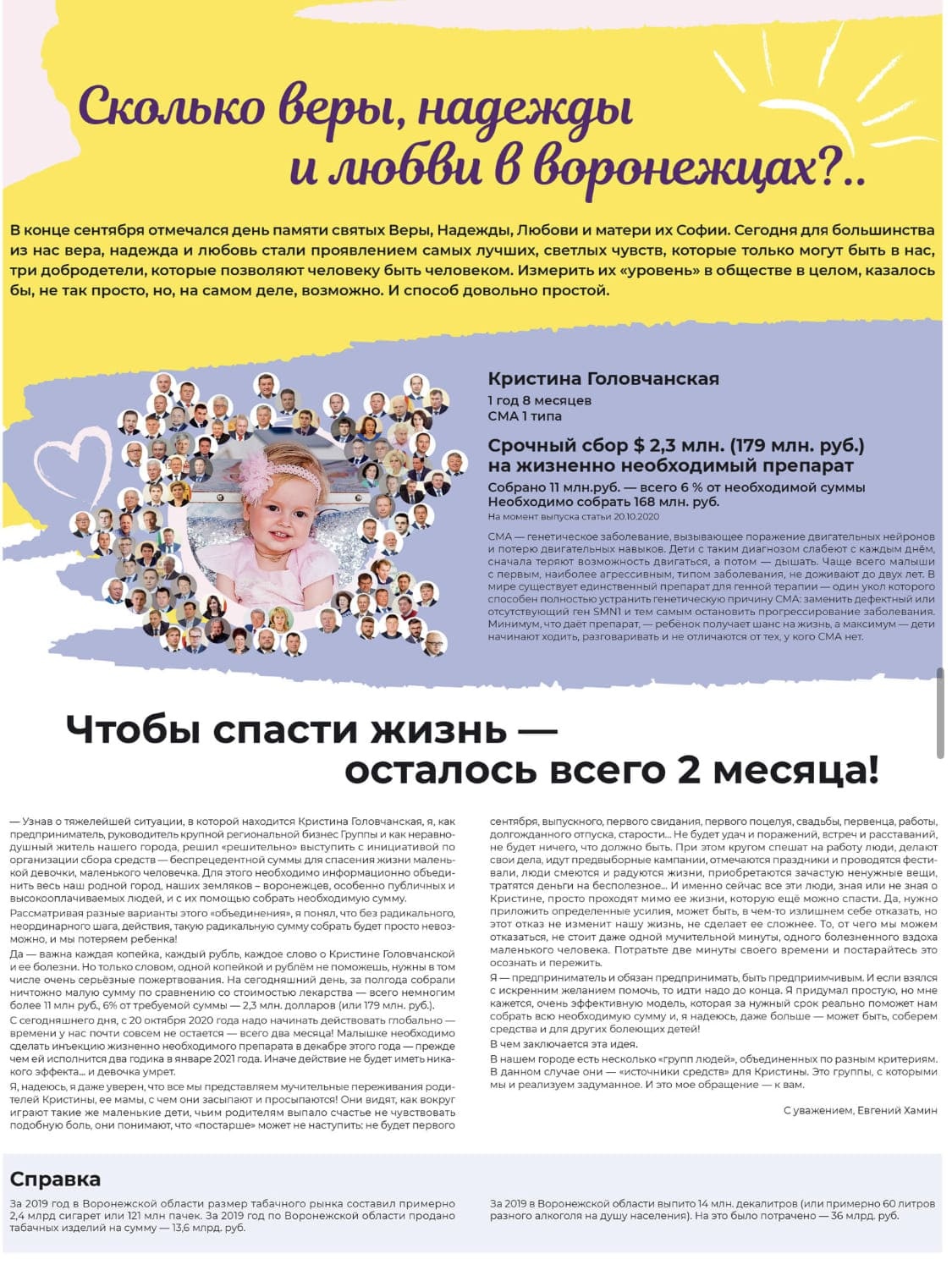 Эта история несколько лет назад прогремела на всю страну. Хамин для того, чтобы собрать много-много денег, а именно 179 миллионов рублей (2,3 млн долл) на спасение полуторалетней девочки Кристины Головчанской с диагнозом СМА (спинальная мышечная атрофия) предпринял совершенно нестандартный ход. Он выкупил в самой популярной газете города четыре полосы и опубликовал там личное обращение к публичным и, скажем так, самым обеспеченным гражданам Воронежа с призывом собрать деньги всем миром. Далее совсем уж необычно: Хамин разместил в газете «иконостас» этих граждан и предложил каждому из них перевести определенную сумму, кому несколько миллионов, кому несколько сотен тысяч, наверное, в соответствии с предполагаемыми доходами. Откликнулись? Нет. Почему?