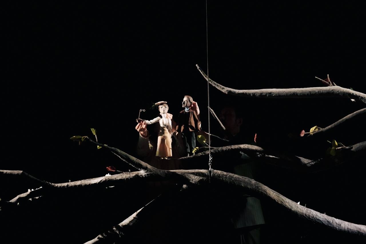 Важной «куклой» спектакля становится пространство. Темные клетки, подвешенные в воздухе, сухое ветвистое дерево‑ось сцены, на которое нанизывают вещи, героев, их встречи и расставания, — всё это постепенно обрастает смыслами. К финалу то самое голое дерево, где только что жили птицы и сидели куклы, вдруг выбрасывает белые цветы, и это простое решение воспринимается как настоящее чудо, случившееся у тебя на глазах.